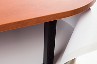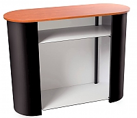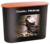 Der elegante Counter PREMIUM hat eine stabile Wildbirnedekor- Thekenplatte (andere Dekors auf Anfrage), eine schwarze, pulverlackierte Aluminiumstellage sowie 2 Ablagen aus Verbundplatte. Optional sind 4 Doppelrollen mit Feststellbremse oder höhenverstellbare Füße erhältlich. Eine gepolsterte Transporttasche sowie eine Kartonhülse für den Druck sind im Lieferumfang enthalten.
