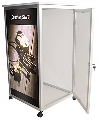 Inbusschlösser ermöglichen einen schnellen Auf- und Abbau, auch die Grafik kann schnell ausgetauscht werden. Der Counter SAVE besteht aus aus eloxierten Aluminiumprofilen, die Tür ist verschließbar (2 Schlüssel im Set). Die Counterplatte ist in Aschgrau lieferbar, auf Bestellung sind auch andere Designs möglich. Die Füllplatten bestehen aus 5 mm Forex. Optional sind Doppelrollen mit Feststellbremse sowie ein Einlegeboden aus Verbundplatte erhältlich.