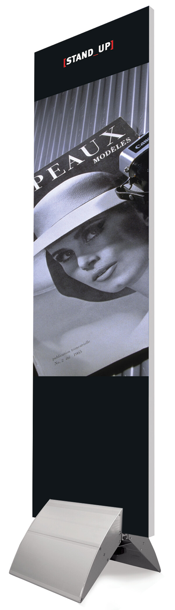 Dieses Klemmprofil aus eloxiertem Aluminium für Grafikflächen von 3 - 30 mm Stärke eignet sich für Glas-, Metall-, Holz- oder Kunststoffflächen und ist für jede denkbare Anwendung sowohl im Innenwie auch im Außenbereich geeignet. STAND UP wird einschließlich Seitenkappen und Transporttasche geliefert.