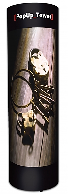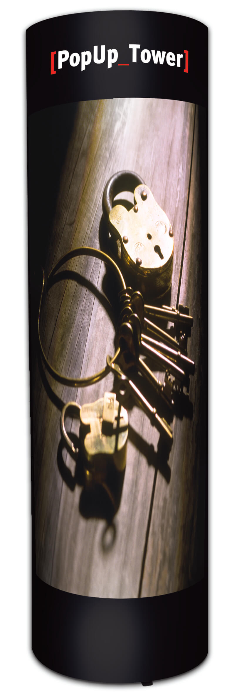 Der runde Pop Up TOWER ist eine mobile und flexible Werbesäule, die sich ideal als Ergänzung für ein Pop Up Display oder als Standalone Lösung eignet.