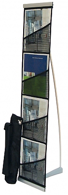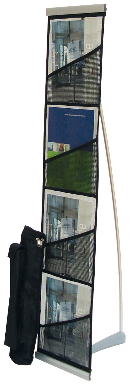Einfacher, aber genialer Prospektständer aus Aluminium und Polyestergewebe. PRO SPEKT ist in zwei verschiedenen Ausführungen lieferbar. Die Lieferung erfolgt in einer handlichen Nylontasche.
